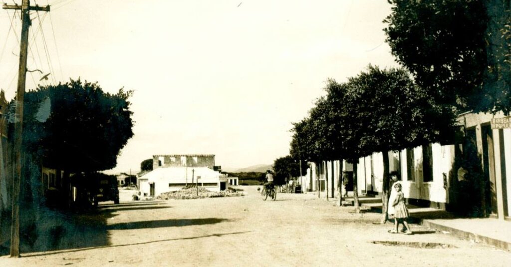 Na cena antiga, predominam casas de adobe, fachadas simples e pequenos estabelecimentos comerciais, típicos de uma cidade que crescia com esforço, trabalho e espírito comunitário. O comércio era modesto, mas pulsava com a dedicação dos pioneiros que ajudaram a construir a história local.