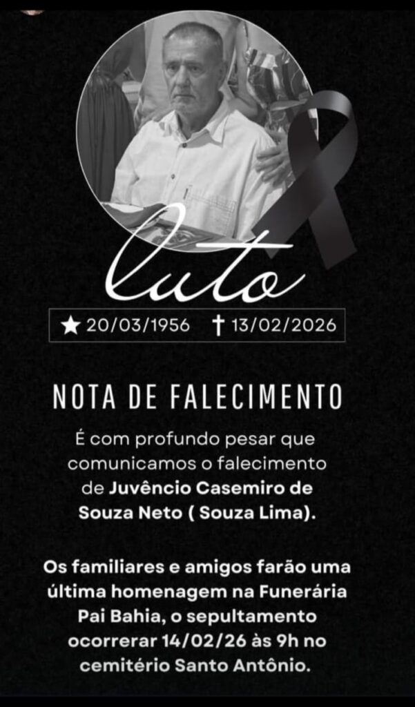 Faleceu em Guanambi, no dia 13 de fevereiro, o montealtense Juvêncio Casemiro de Souza Neto, conhecido como “Souza”. Figura respeitada em Palmas de Monte Alto, Souza atuou como vereador e também como comerciante, deixando sua contribuição à vida pública e ao desenvolvimento do município. Na década de 1990, mudou-se para Guanambi, onde construiu uma nova história, marcada por amizades sinceras e pelo bom relacionamento com todos que o conheciam. Sua morte, aos 69 anos, trouxe profunda tristeza aos familiares, amigos e a todos que tiveram o privilégio de conviver com ele.