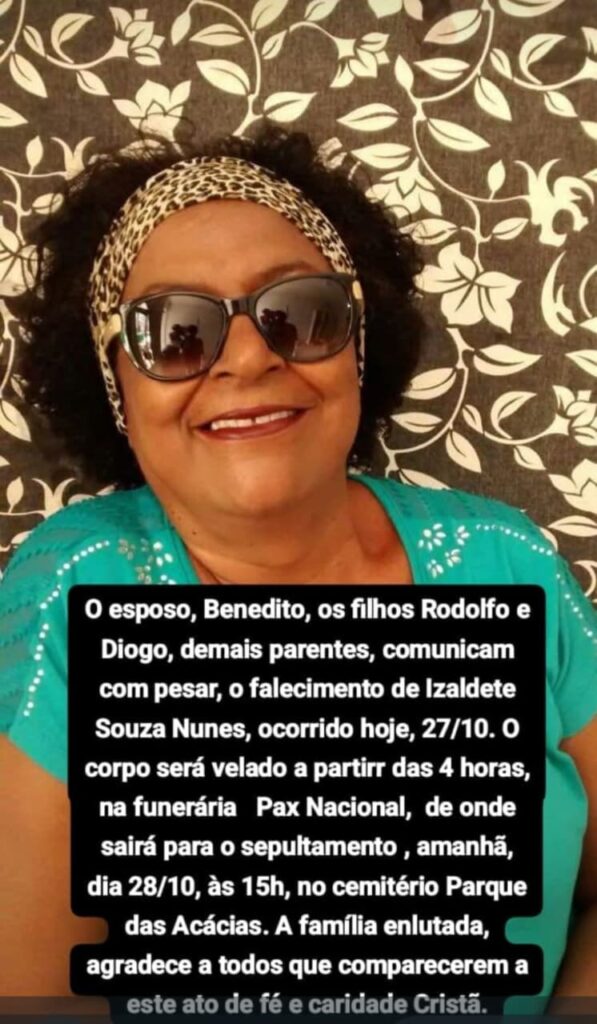 O esposo, Benedito, os filhos Rodolfo e Diogo, demais parentes, comunicam com pesar, o falecimento de Izaldete Souza Nunes, ocorrido ontem, 27/10.