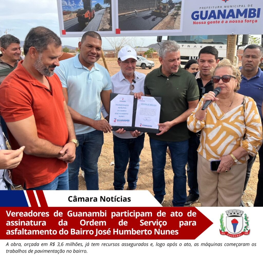 Na manhã desta sexta-feira (19), vereadores da Câmara Municipal de Guanambi participaram do ato de assinatura da Ordem de Serviço para o asfaltamento do Bairro José Humberto Nunes. O evento, conduzido pelo prefeito Arnaldo Azevedo (Nal), contou ainda com a presença do vice-prefeito Zaqueu Rodrigues, do deputado estadual Felipe Duarte, secretários municipais e lideranças comunitárias.